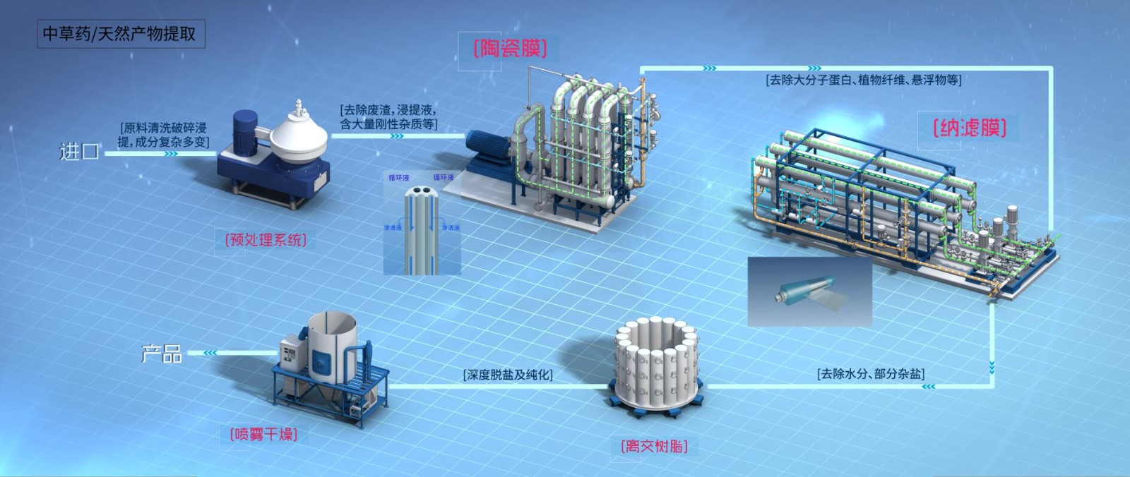 食品與飲料、天然產物的初始料液成分複雜,常含有微生物、纖維、鞣質、油脂、色素、無機鹽、酚類、蛋白質、果膠等雜質,傳統過濾提純工藝難以有效去除雜質或純化產品,膜集成技術整體解決方案能夠有效利用膜材料和樹脂等與天然產物分子量和電荷等的匹配性,對有效成分進行選擇及富集,從而實現產品的過濾、分離與純化,提高產品質量和收率,降低運營成本並維護人類健康。