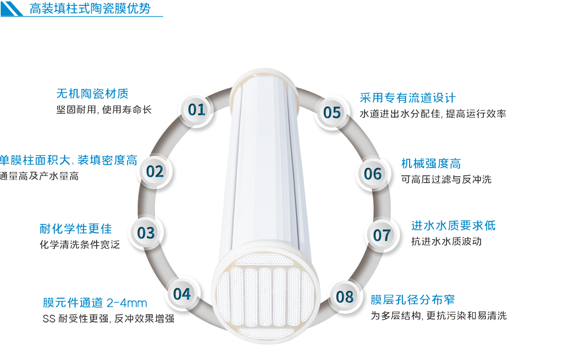 午夜福利视频导航高裝填柱式午夜视频无码是在午夜福利视频导航傳統管式午夜视频无码及平板式午夜视频无码技術基礎上研製出的一款用於水處理的無機超濾膜。高裝填柱式午夜视频无码是采用高強度α-Al2O3在高溫下焙燒製成,擁有良好的耐高溫性能,抗化學腐蝕性,優秀的機械強度。相對傳統多通道管式午夜视频无码,高裝填柱式午夜视频无码單支膜管過濾麵積可達 10-25 ㎡,擁有更大的裝填密度及處理能力,能夠有效去除固體懸浮物、細菌以及膠體等物質,可應用於民用安全用水、市政給水和廢水處理、應急供水、水回用、工業過程廢水等多個領域。